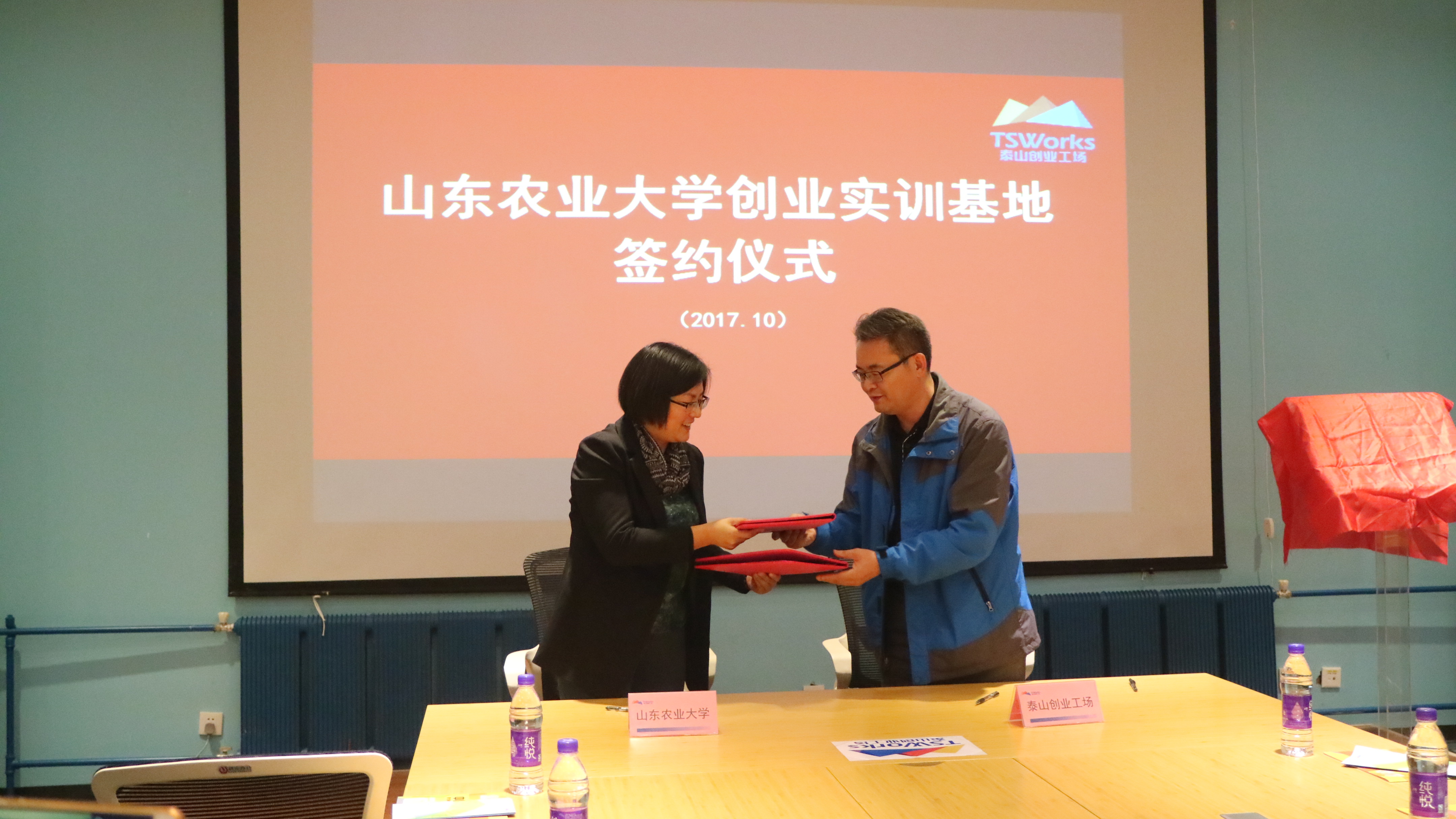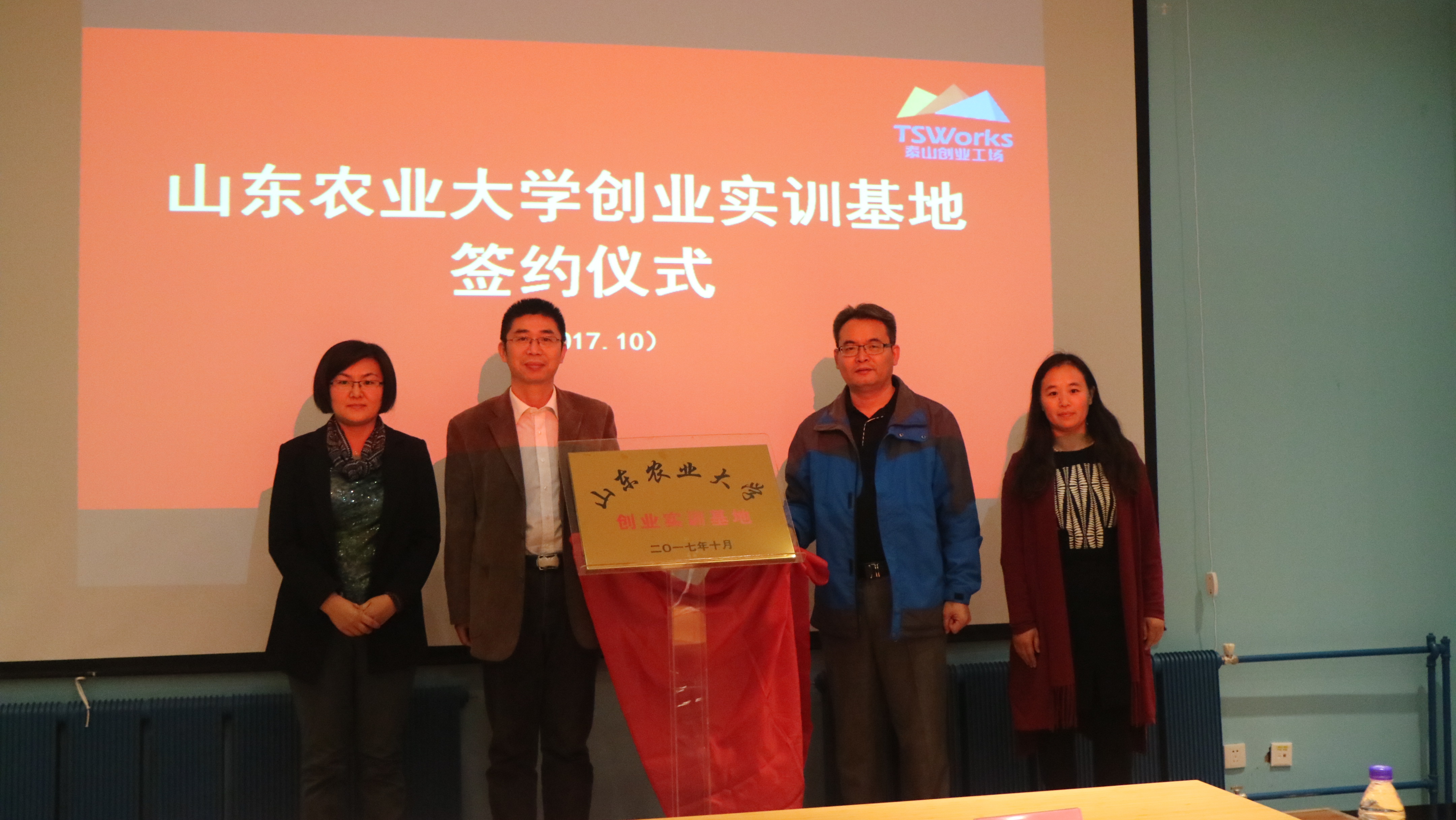 10月12日,学校在泰山创业工场设立创业实训基地,学生工作处处长王群、泰山创业工场总经理王军、学工处相关负责同志以及创业学生代表参加基地揭牌仪式。