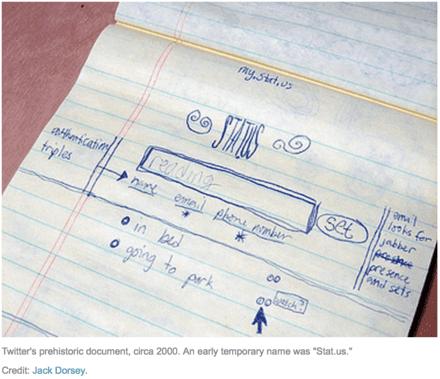2006 年 2 月,当时只是公司一名普通工程师的杰克·多西和创始人们一起讨论公司的方向,他提出,可以做发短信分享状态的产品。这个产品,是他在 6 年前( 2000 年)想出来的,并画了个简单的线框图。