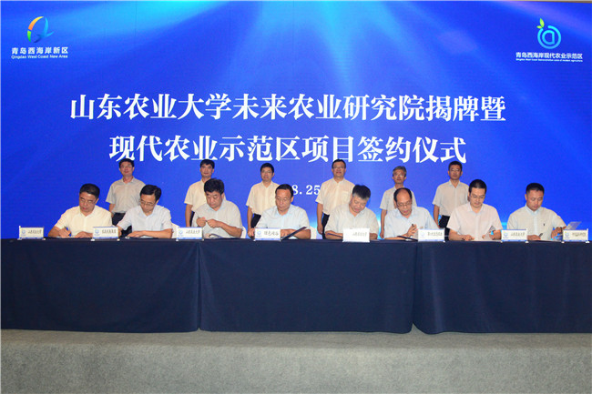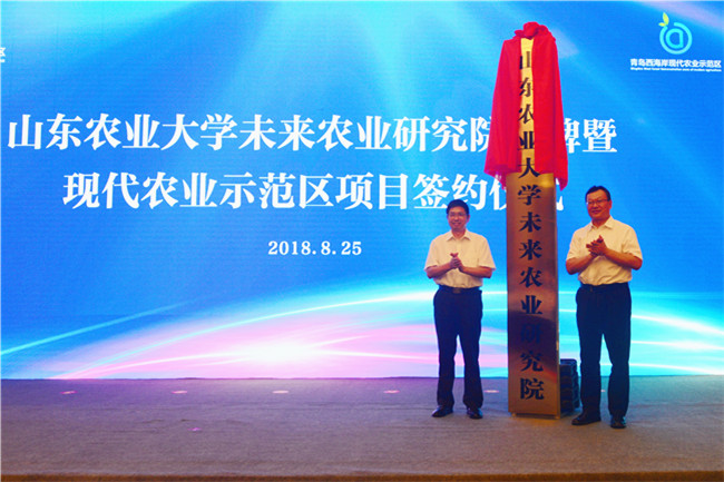 8月25日,山东农业大学未来农业研究院在青岛西海岸新区揭牌成立。校长张宪省,青岛西海岸新区管委主任、区长李奉利共同为研究院揭牌。